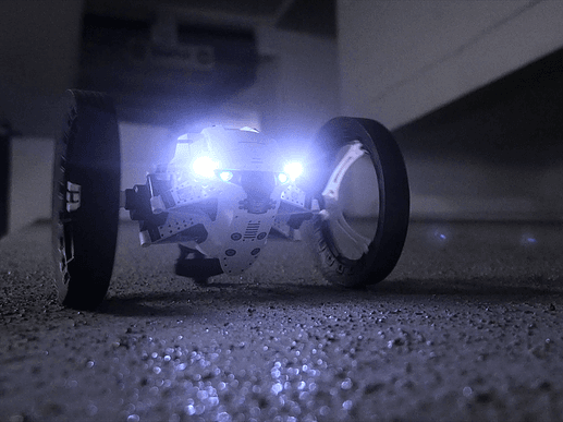 Évoquons maintenant notre drone roulant de prédilection : « le Parrot Minidrone Jumping Sumo » de son nom complet . Avec ses roues larges, le Jumping Robot roule à 13 km/h. Doté d’une caméra, il se pilote en immersion depuis une tablette. Très maniable, le Jumping Robot effectue des virages à 90 degrés et à 180 degrés en un instant. Surtout, il peut sauter une hauteur de près de 80 centimètres ! Ses capacités en font l’un des plus fun à prendre en main.
